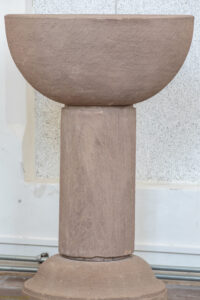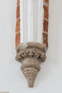 De ribben van de kruisgewelven steunen op kraagstenen, waarvan enkele wellicht uit de elfde eeuw stammen.